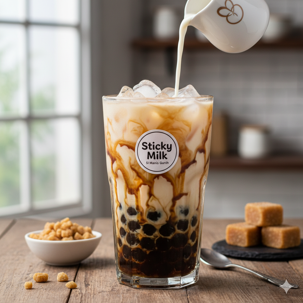 Secara sederhana, Sticky Milk adalah minuman berbasis susu segar yang disajikan dengan bola tapioka (boba) yang telah dimasak dalam sirup gula merah kental. Nama “Sticky” (lengket) sendiri merujuk pada tekstur sirup gula merah yang kental, karamel, dan sedikit lengket ketika menempel di dinding gelas.